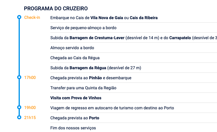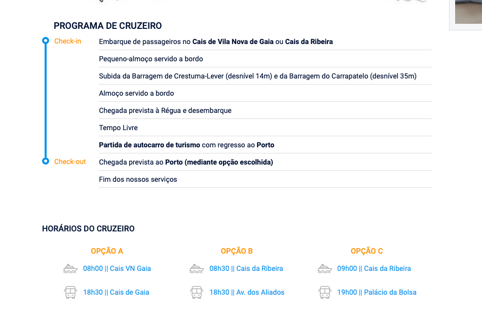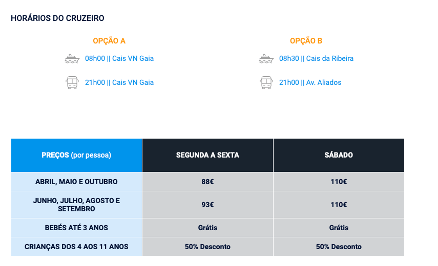 As Experiências e Bilhetes desde o Porto são:
